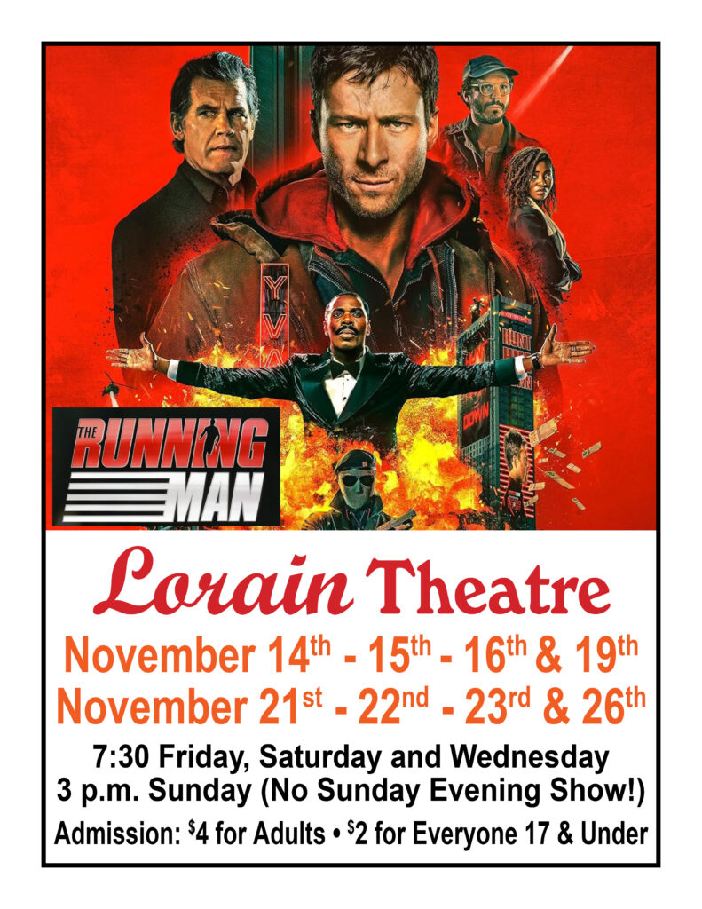 November 21-22-23 & 26In the near future, “The Running Man” is the top-rated show on television, a deadly competition where contestants must survive 30 days while being hunted by professional assassins. Desperate for money to save his sick daughter, Ben Richards is convinced by the show’s ruthless producer to enter the game as a last resort. Ratings soon skyrocket as Ben’s defiance, instincts and grit turn him into an unexpected fan favorite, as well as a threat to the entire system. Rated R. Running time: 2 hours 13 minutes.